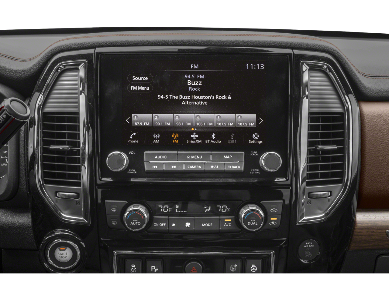 - Radio: NissanConnect w/Navigation -inc: 9" touchscreen display, 12 speaker Fender premium audio system, wireless Apple CarPlay, Android Auto, SiriusXM radio, Nissan door to door navigation w/3D building graphics and satellite imagery, connected navigation features including online POI search, over-the-air map updates and online premium traffic information, SiriusXM Traffic, SiriusXM Travel Link w/weather, fuel prices, movie listings, stock info, sports and parking, TomTom weather, follow me home function, 2 illuminated USB connections (1 type A, 1 type C), 2 USB-A charge only ports, Bluetooth® hands-free phone system, streaming audio via Bluetooth® and hands-free text messaging assistant